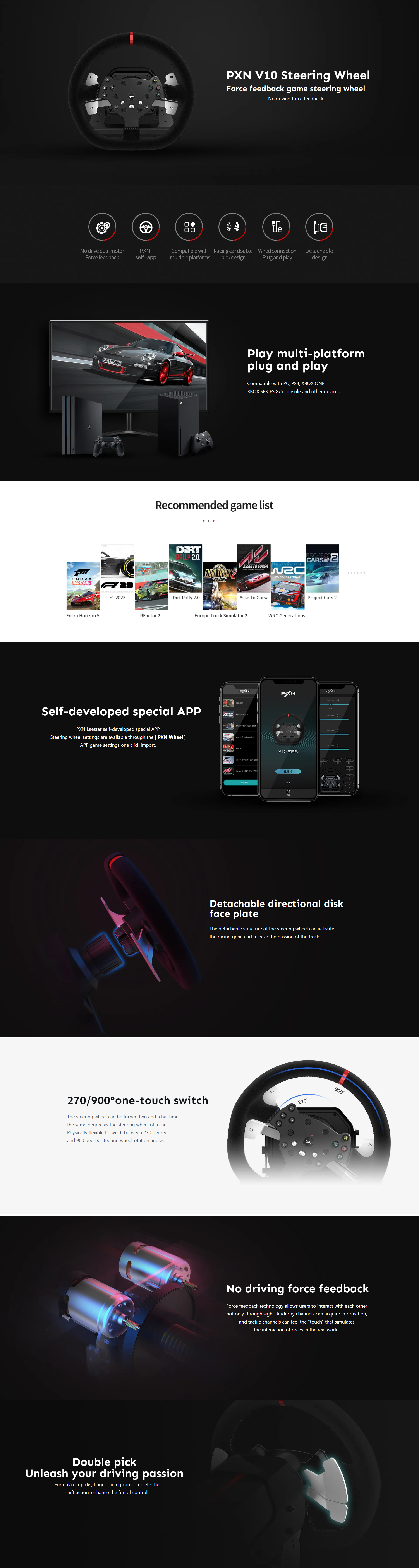The PXN V10 is a drive free dual motor with force feedback that support Multiple Platforms. It has a Racing Dual Paddle and detachable Design, wired connection and Plug and play.