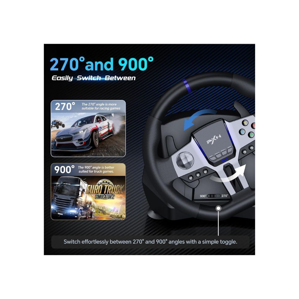 - 270&900 Rotation: A physical button allows for easy and flexible switching between 270-degree and 900-degree rotation angles. The 900-degree setting is ideal for driving simulation games like Euro Truck Simulator and American Truck Simulator. The 270-degree setting is perfect for racing games such as Need for Speed, Forza Horizon 4, and GTA 5.